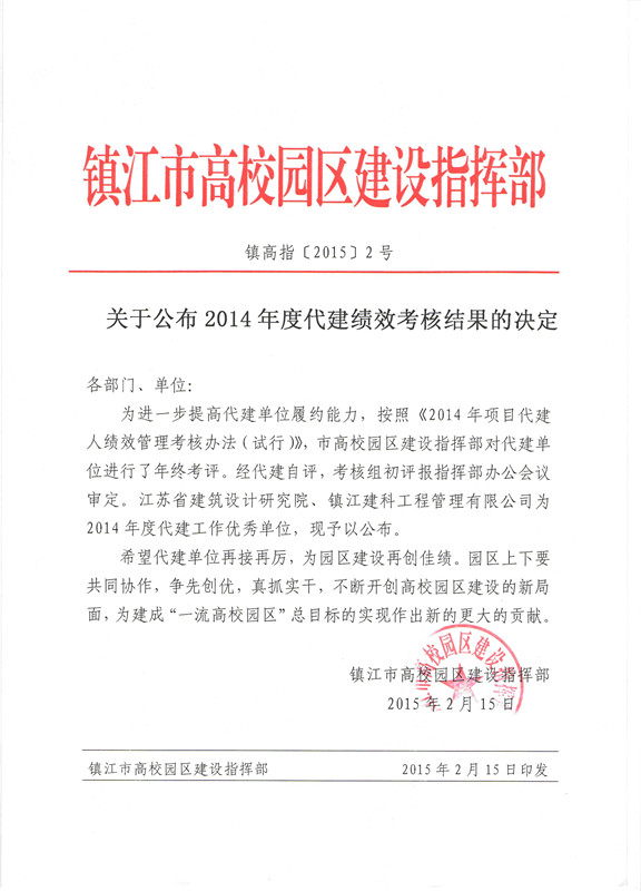 祝賀鎮(zhèn)江建科工程管理有限公司獲評為2014年度代建工作優(yōu)秀單位