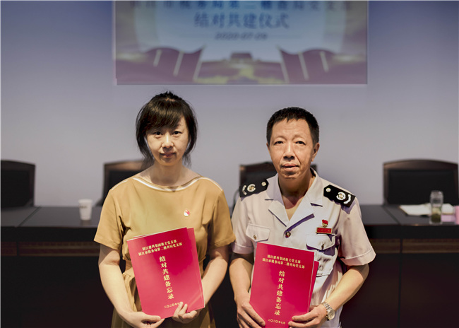 鎮(zhèn)江建科集團(tuán)機(jī)關(guān)黨支部書記周梅與第二稽查局黨支部書記陳康共同簽署并互換備忘錄,雙方與會(huì)代表合影留念。