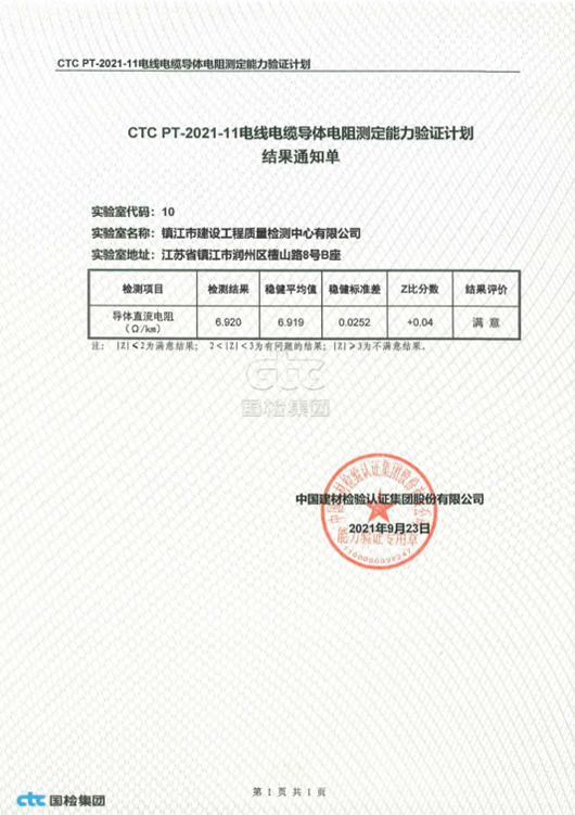此次能力驗(yàn)證的順利通過,充分體現(xiàn)了我中心質(zhì)量控制體系運(yùn)行有效,在電線電纜檢測(cè)項(xiàng)目中導(dǎo)體直流電阻的檢測(cè)方面具有良好的技術(shù)能力。