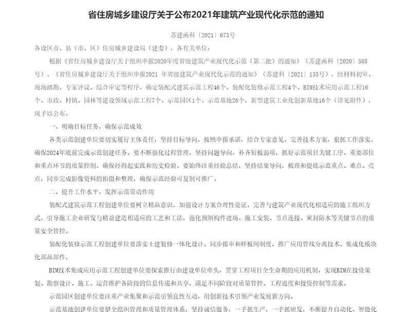日前,江蘇省住房和城鄉(xiāng)建設(shè)廳下發(fā)蘇建函科〔2021〕673號文件《關(guān)于公布2021年建筑產(chǎn)業(yè)現(xiàn)代化示范的通知》,科技公司獲批江蘇省建筑產(chǎn)業(yè)現(xiàn)代化示范基地。