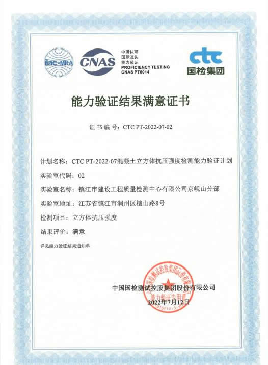 由國(guó)檢集團(tuán)組織開(kāi)展的國(guó)家級(jí)實(shí)驗(yàn)室能力驗(yàn)證項(xiàng)目—混凝土立方體抗壓強(qiáng)度檢測(cè)(代號(hào):CTC PT-2022-07)結(jié)果近日公布,檢測(cè)中心以滿(mǎn)意的結(jié)果順利通過(guò)。