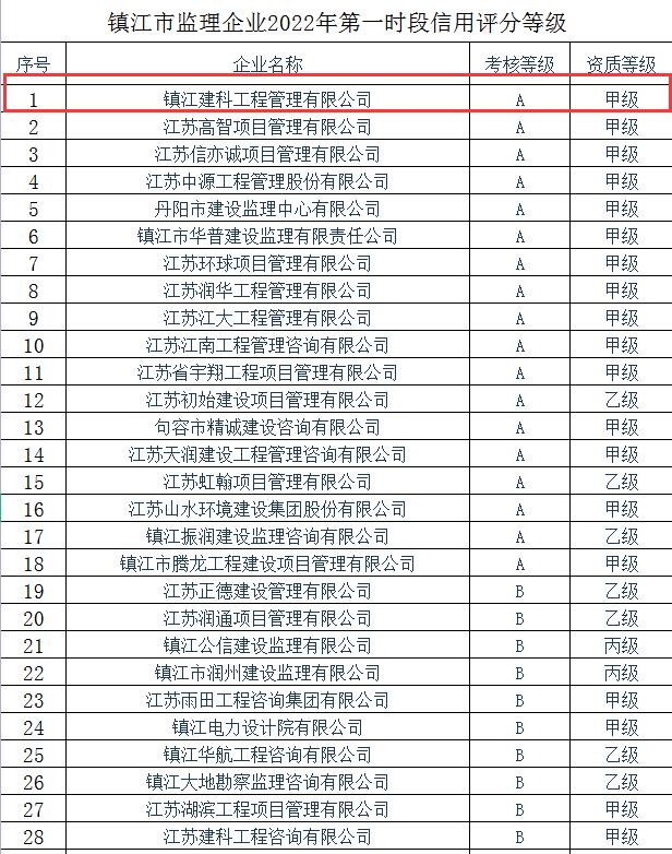 根據(jù)鎮(zhèn)江市住房和城鄉(xiāng)建設(shè)局2022年07月11日發(fā)布的鎮(zhèn)建建管【2022】62號(hào)《關(guān)于開展鎮(zhèn)江市監(jiān)理企業(yè)2022年第一時(shí)段信用分評(píng)價(jià)工作的通知》,我公司按要求及時(shí)上傳了所需評(píng)價(jià)各類文件。本次考核評(píng)價(jià)主要包含企業(yè)基本信用分、納稅得分、在建項(xiàng)目綜合考核分和日?己朔炙膫(gè)部分。本次共有52家監(jiān)理企業(yè)參與考核評(píng)價(jià),比上一時(shí)段增加了6家參評(píng)單位。最終我公司得分102.08分,繼續(xù)排在全市第一。我公司將以此次信用評(píng)價(jià)為動(dòng)力,保持平常心態(tài),不驕不躁,繼續(xù)深入掌握考核細(xì)則解讀,并以此促進(jìn)我公司監(jiān)理各項(xiàng)工作進(jìn)步落實(shí)。