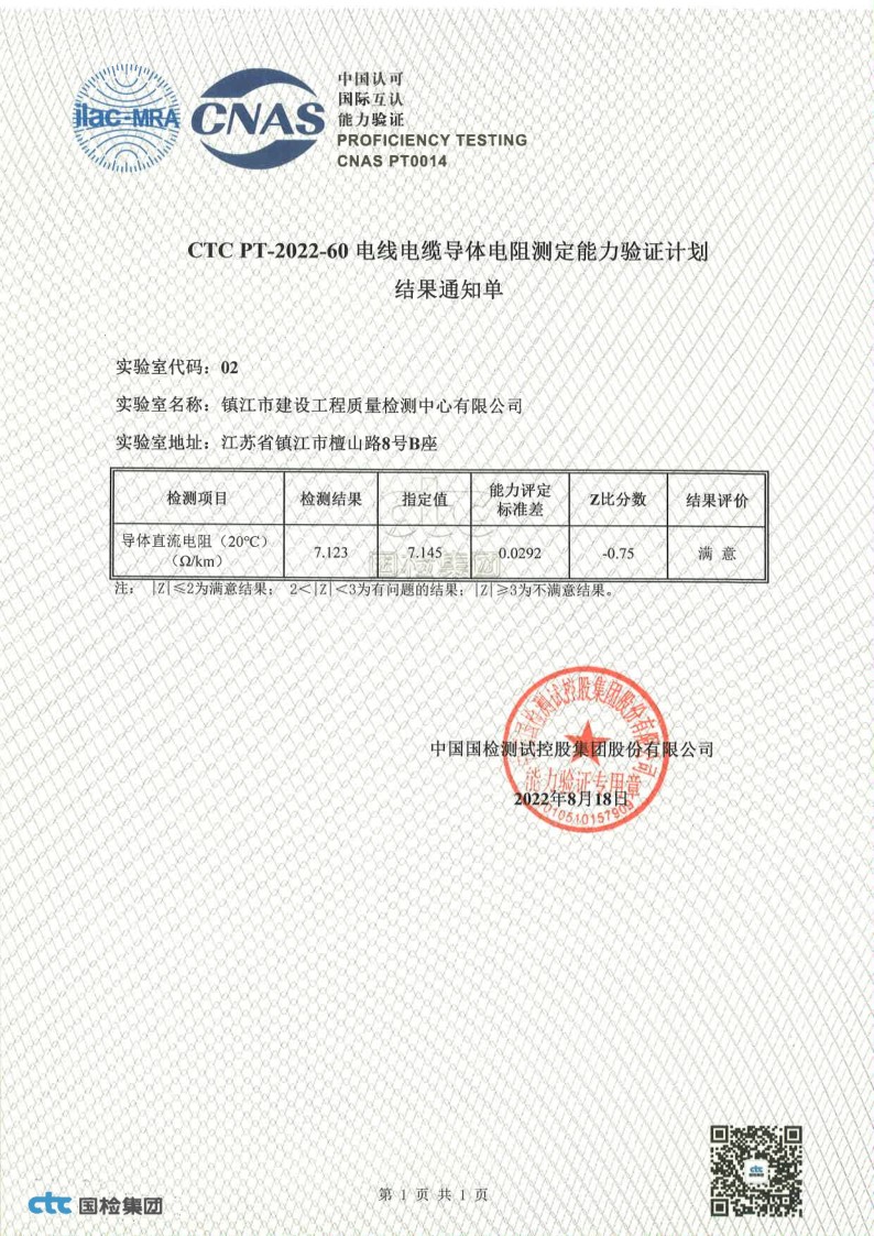 為檢驗我中心實驗室的檢測水平,2022年6月,我中心報名參加了中國國檢測試控股集團股份有限公司組織的“CTC PT-2022-60電線電纜導(dǎo)體電阻測定”能力驗證,2022年8月收到能力驗證結(jié)果通知單,我中心提交的檢測結(jié)果評價為“滿意”。