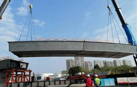 第2聯(lián)橋梁需要跨越寧杭南路S6地鐵區(qū)域,由于地鐵較淺,跨度大,設(shè)計采用鋼箱梁結(jié)構(gòu)。鋼箱梁長度118米,高2米,采用單箱雙室結(jié)構(gòu)薄壁結(jié)構(gòu),總重量652噸。