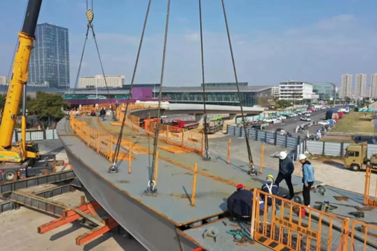 工程于2021年10月1日開工。目前道路工程路基施工已經(jīng)全部結(jié)束。路面結(jié)構(gòu)層正在施工。連接寧杭南路和勤學(xué)路及站房的A匝道橋全長894.194米,中間落客平臺區(qū)域為21米寬,其余區(qū)域為9~10米寬。橋梁上部結(jié)構(gòu)為8聯(lián)預(yù)應(yīng)力砼結(jié)構(gòu)箱梁,1聯(lián)鋼箱梁結(jié)構(gòu)。目前預(yù)應(yīng)力箱梁結(jié)構(gòu)全部施工張拉完畢,難度最大的為第2聯(lián)鋼箱梁正在施工。