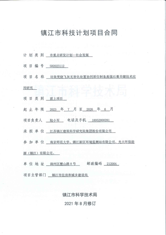 近日,由我院科技公司牽頭,新區(qū)監(jiān)測(cè)站為重要技術(shù)支撐,聯(lián)合南京師范大學(xué)、光大環(huán)保能源(鎮(zhèn)江)有限公司申報(bào)的鎮(zhèn)江市重點(diǎn)研發(fā)(社會(huì)發(fā)展)項(xiàng)目《垃圾焚燒飛灰無害化處置協(xié)同原位制備高強(qiáng)石膏關(guān)鍵技術(shù)應(yīng)用研究》獲鎮(zhèn)江市科技局資金支持,項(xiàng)目編號(hào):2023ZD105,陸小軍副院長為項(xiàng)目負(fù)責(zé)人。